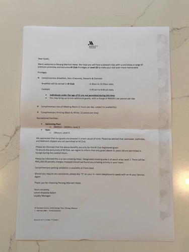 In addition to the dining benefits, guests staying with M Club access at Penang Marriott Hotel can enjoy several useful privileges that enhance the overall stay. These include complimentary use of a meeting room for up to two hours per day (subject to availability), as well as free black-and-white printing of up to 15 pages per stay—particularly convenient for business travellers or those needing quick document access. Guests are also allowed to bring along one additional visitor into the lounge, although this is subject to an extra charge of approximately RM200+ per person per day.