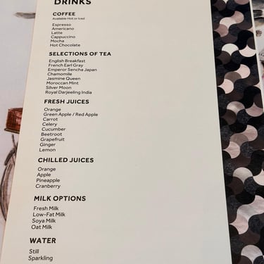 The beverage selection is equally impressive, with barista-style coffee including espresso, cappuccino, and latte, alongside a wide range of teas from English Breakfast and Earl Grey to Japanese sencha and chamomile. Fresh juices like orange, apple, carrot, and even beetroot are available, complemented by chilled juices, multiple milk options including oat and soy, and both still and sparkling water.